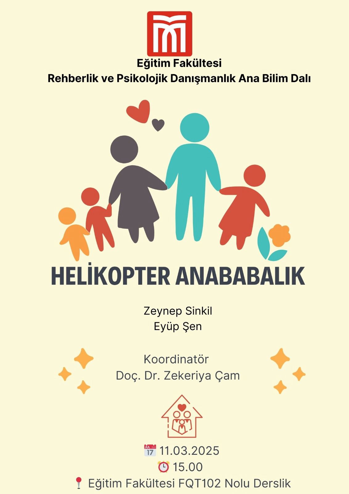 Ana Bilim Dalımız bünyesinde verilen Rehberlik ve Psikolojik Danışmanlık Semineri dersi kapsamında, PDR 4. sınıf öğrencilerimizin seminer sunumları başlıyor. Seminer sunumlarına öğrencilerimizden Zeynep Sinkil ve Eyüp Şen "Helikopter Anababalık" konusu ile başlayacak olup, sunumları 11.03.2025 tarihinde 15.00'te FQT 102 dersliğinde gerçekleştirilecektir.