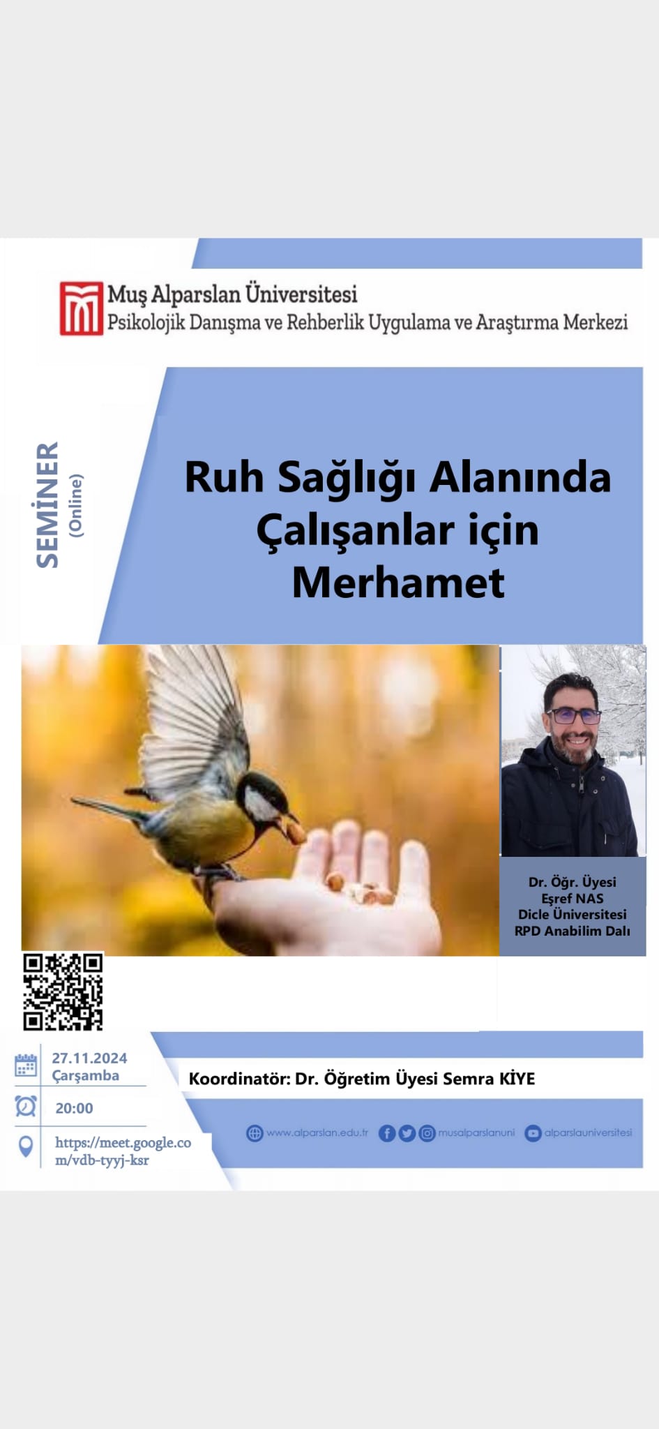 Ana Bilim Dalımız öğretim elemanlarından Dr. Öğr. Üyesi Semra KİYE moderatörlüğünde, Dicle Üniversitesi, Rehberlik ve Psikolojik Danışmanlığı Bölümü öğretim elemanı Dr. Öğr. Üyesi Eşref NAS ile "Ruh Sağlığı Alanında Çalışanlar için Merhamet" isimli online seminer gerçekleştirilecektir.